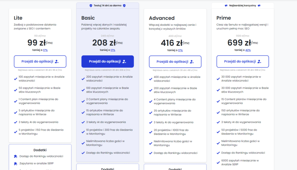 Senuto na koniec roku 2023 zmieniło cennik. Niestety zmieniły się nie tylko ceny, ale także limity w poszczególnych modułach. W ten sposób specjaliści dostają mniej za więcej – płacą więcej i dostają mniej funkcji w pakiecie. O ile więc podwyżki spowodowane wzrostem kosztów są normalne to w mojej opinii aktualne ceny są: